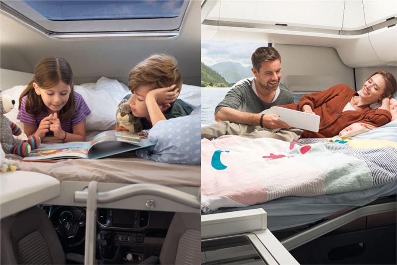 Gördüğünüz anda etkileyen, üstüne yattığınız anda rahatlatan büyük bir yatak düşünün… Hatta bu yatağın manzarasının her gün değişebildiğini. İşte Grand California’nın yetişkin yatağı böyle bir şey. İki yetişkin için yanlamasına yerleştirilmiş yatak1.930 mm’ye 1.360 mm’lik büyüklüğe sahipken, kabin üstü yatak ise 1.600 mm’ye 1.900 mm’lik boyuyla oldukça geniş. 1.220 mm’lik merdiveniyle kabin üstü yatağa tırmanmak özellikle çocuklar için çok eğlenceli. Panoramik cam sayesinde gökyüzünü izleyerek uyumaksa ayrı bir keyifli…