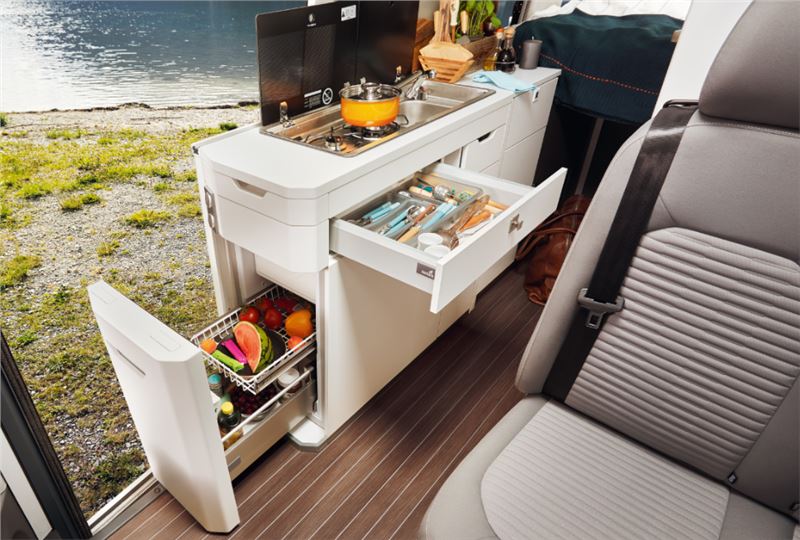 Grand California, adı gibi büyük ihtiyaçlarınız için tasarlandı. İster sahil kenarında ister dağın tepesinde ya da nehrin yanı başında olun, mutfağınız her yere sizinle geliyor. 4 kişilik yemek masasıyla her çeşit manzarada yemek yapmak kadar yaptıklarınızı yemek de çok keyifli. İki gözlü ocağı, sıcak ve soğuk suya sahip katlanır musluklu eviyesi ve 70 litrelik dondurucu bölmeli buzdolabıyla tam donanımlı bir mutfağa sahip.