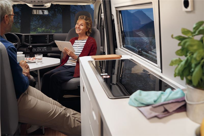 Dokunmatik ekranlı karavan kontrol ünitesiyle Grand California’nın iç sıcaklığını dilediğiniz gibi ayarlayabilirsiniz. Bu ekrandan araç içini, dışını, üst yatak bölümünü ve ambiyans aydınlatmalarını kontrol edebilirsiniz.Kamp moduyla klima sistemi, su dolum seviyeleri, ilave akü şarj seviyesi, klima sisteminin mevcut durumu, su ve havanın sıcaklığı ve hatta 230 V enerji bağlantısının takılı olup olmadığına kadar her şeyi görüntüleyebilirsiniz.