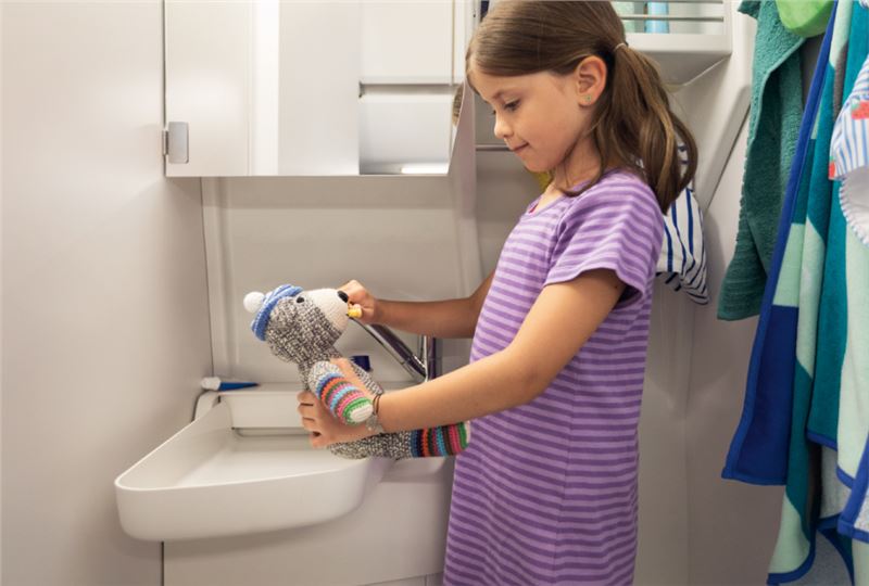 Grand California küçük bir evin tüm donanımına sahip. İçi o kadar geniş ki lavabosu, duşu ve tuvaletiyle her türlü ihtiyacınız için 7/24 hazır. 18 litrelik tuvalet kartuşu ise uzun kamplar için ideal.