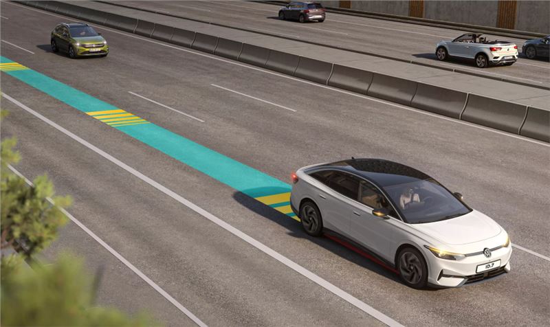 Acil Durum Asistanı "Emergency Assist" sayesinde ID.7, sürücünün direksiyonla temas etmemesi durumunda öncelikle görsel ve işitsel uyarılar verir. Eğer sürücü bu uyarılara yanıt vermezse, emniyet kemerini birkaç kez sıkıp bırakarak ve hafif titreşimler oluşturarak sürücüyü direksiyonun kontrolünü devralması için ikaz eder. Son aşamada, sürücüden hâlâ bir tepki alınamazsa ID.7'yi kontrollü bir şekilde yavaşlatan Emergency Assist, aracı bulunduğu şeritte güvenli bir şekilde durdurur. Bu sırada dörtlü sinyalleri etkinleştirerek çevredeki sürücüleri uyarır. (P)