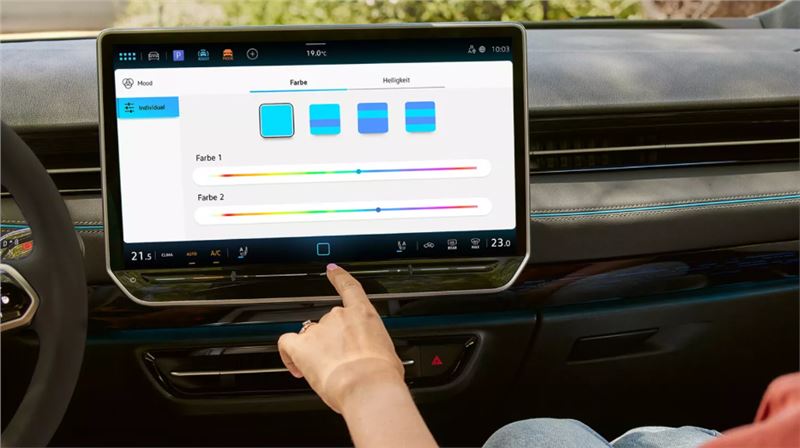 ID.7’nin ambiyans aydınlatması, iç mekânda sofistike bir atmosfer yaratarak her yolculuğu özel kılar. Kullanıcı tercihine göre kişiselleştirilebilen 30 renk seçeneği sayesinde, ruh halinize uygun bir ortam oluşturur. İster rahatlatıcı bir mavi ister enerjik bir kırmızı; ID.7, tarzınızı ve modunuzu yansıtan aydınlatmayı sunar. Gösterge panelinden kapı içlerine kadar kusursuz bir şekilde entegre edilen ışık çizgileri, ID.7'nin modern tasarımını vurgulark