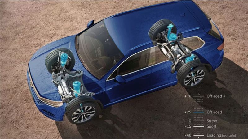 Touareg, nasıl bir sürüş deneyimi istediğinize karar vermenize imkân verir. Sürüş moduna bağlı olarak havalı süspansiyon, aracı yerden maksimum 258 mm'lik bir yüksekliğe kadar kaldırabilir. Aynı zamanda aracın arka kısmı da yükleme veya boşaltma için uygun olacak şekilde 40 mm kadar indirilebilir.Saatte 120 km hıza çıkıldığında ya da "Sport" modu seçildiğinde ise Touareg, normal sürüş yüksekliğinden 15 mm daha alçak bir seviyeye yerleşir ve amortisörler sertleşir. (E) (R)