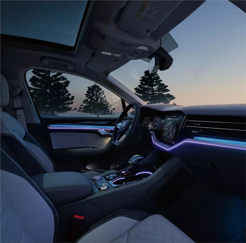 Yüksek kaliteli, uyumlu şekilde bir araya getirilen materyaller ve akılcı aydınlatma tasarımı anında kendinizi iyi hissetmenizi sağlar. Çift dikişli iç tasarım komponentleri gösterge panelinden kapı eşiğine kadar uzanır. Açık renk çizgilerle kaplı dekoratif kaplamaların yanına Elegance donanım seviyesinde standart olarak sunulan ahşap iç dekor, opsiyonel olarak sunulan alüminyum iç dekor ve R-Line donanım seviyesinde standart olarak sunulan koyu alüminyum iç dekor sayesinde Yeni Touareg’e özel hoş vurgular yer alır. Yeni Touareg'inizin ambiyans aydınlatması da ruh halinizi yansıtır. Merkezi Bilgi ve Eğlence Sistemi ekranından dokunmatik olarak seçebileceğiniz 30 farklı renk seçeneği arasından istediğinizi seçin ve her yolculukta kendiniz ve yolcularınız için mükemmel bir atmosfer yaratın. Dingin, huzurlu, dinamik veya sportif... Yeni Touareg'iniz sizi her gece istediğiniz atmosferde karşılar. (E) (R)
