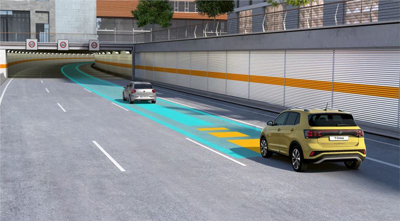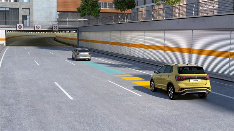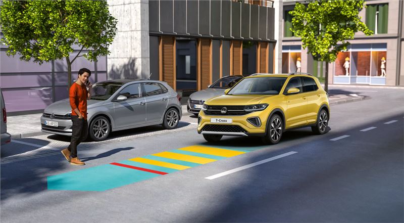 Yaya algılama özelliğine sahip Ön Bölge Asistanı "Front Assist", bir yaya ya da başka bir araç ile çarpışma durumunda kazanın şiddetini azaltmaya yardımcı olur veya ideal durumlarda kazayı tamamen önleyebilir. T-Cross’un önünde bulunan gelişmiş bir radar, aracın önünde uzanan bölgeyi, yoldaki yayalara ve araçlara yönelik olarak sürekli olarak tarar. Tehlikeli bir yaklaşma tespit edildiğinde sistem, sürücüyü sesli ve görsel ikazlarla uyarır ve kontrolü ele almasını bekler. Acil bir durumda ise sürücü yerine otomatik olarak fren yaparak kazayı önlemeye çalışır. 1 (L) (ST) (R)